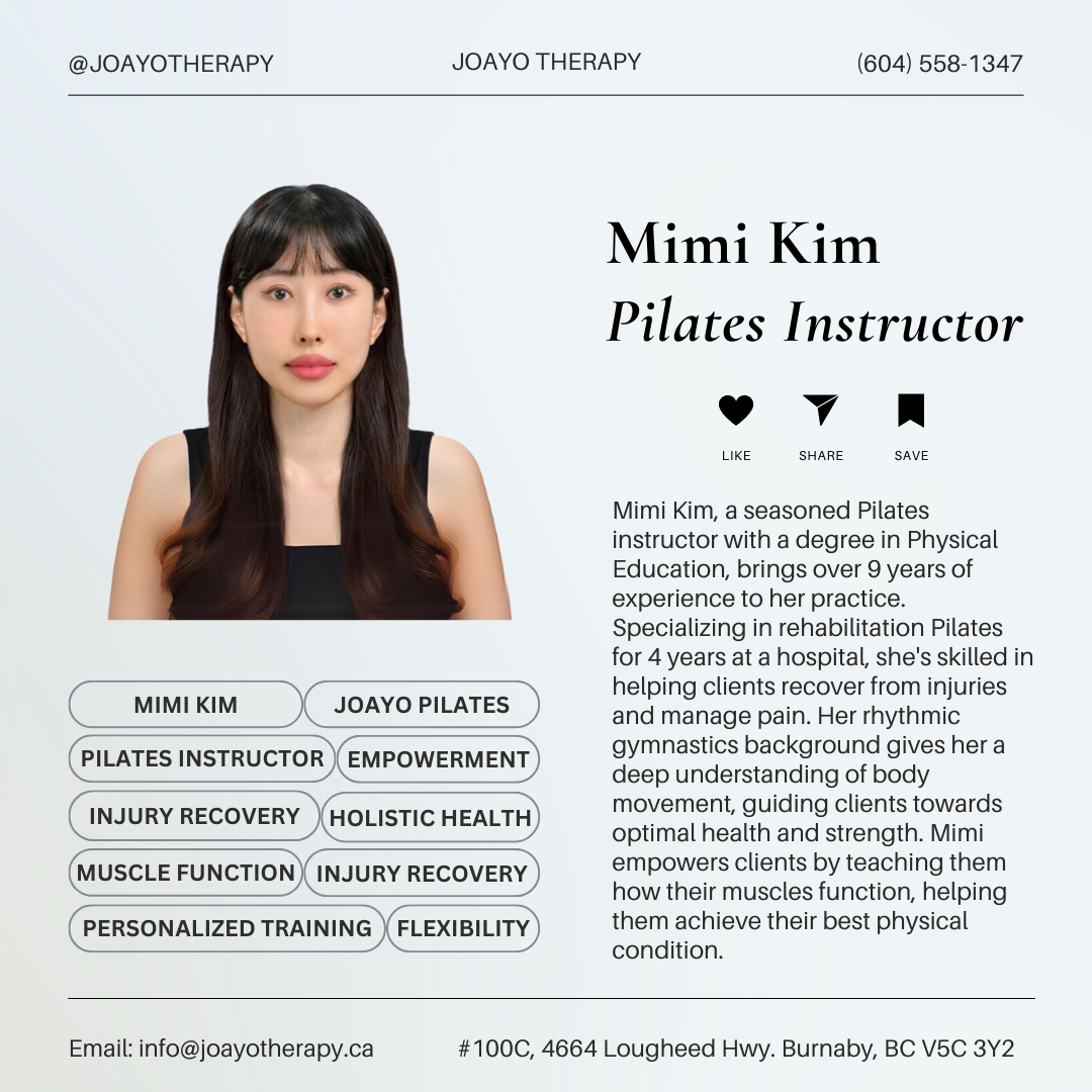 With a Bachelor’s degree in Physical Education and over nine years of Pilates instruction, Mimi Kim combines academic knowledge with hands-on expertise. Her career began with four years in a hospital-affiliated rehabilitation Pilates program, where she specialized in helping clients recover from injuries and manage pain. This experience gave her a deep understanding of biomechanics and the therapeutic role Pilates plays in healing.